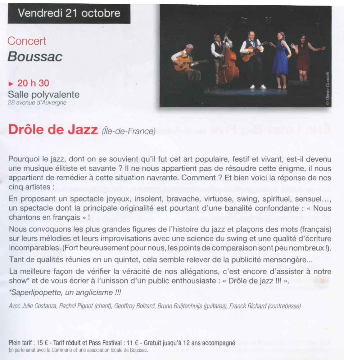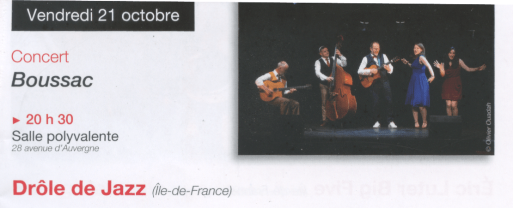 Concert in Boussac, Friday October 21 2022 at 20:30 in the Salle polyvalente.