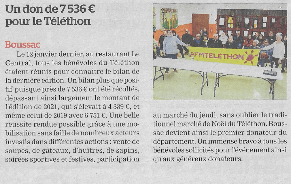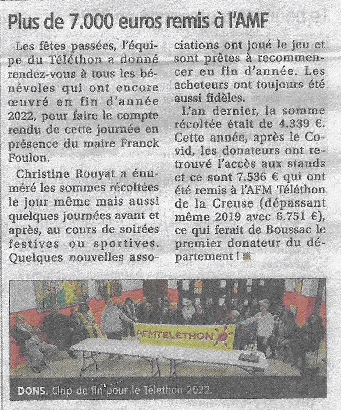 Last year, the sum raised was €4,339. This year, after Covid, the vistors had access to the stands and 7,536 € was raised and given to the AFM Téléthon de la Creuse (exceeding even 2019 with 6,751 €), which would make Boussac the highest donator of the department!