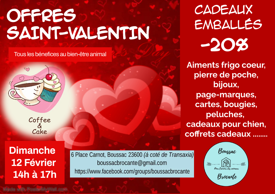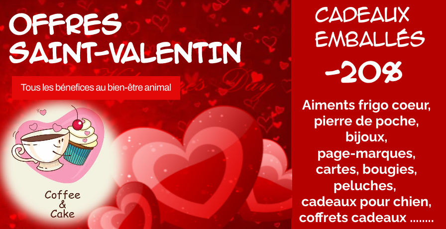 Il y aura 20% de rabais sur tout en magasin. De jolis cadeaux pour vos proches pour la Saint Valentin. Amis, famille et animaux de compagnie, bien sûr