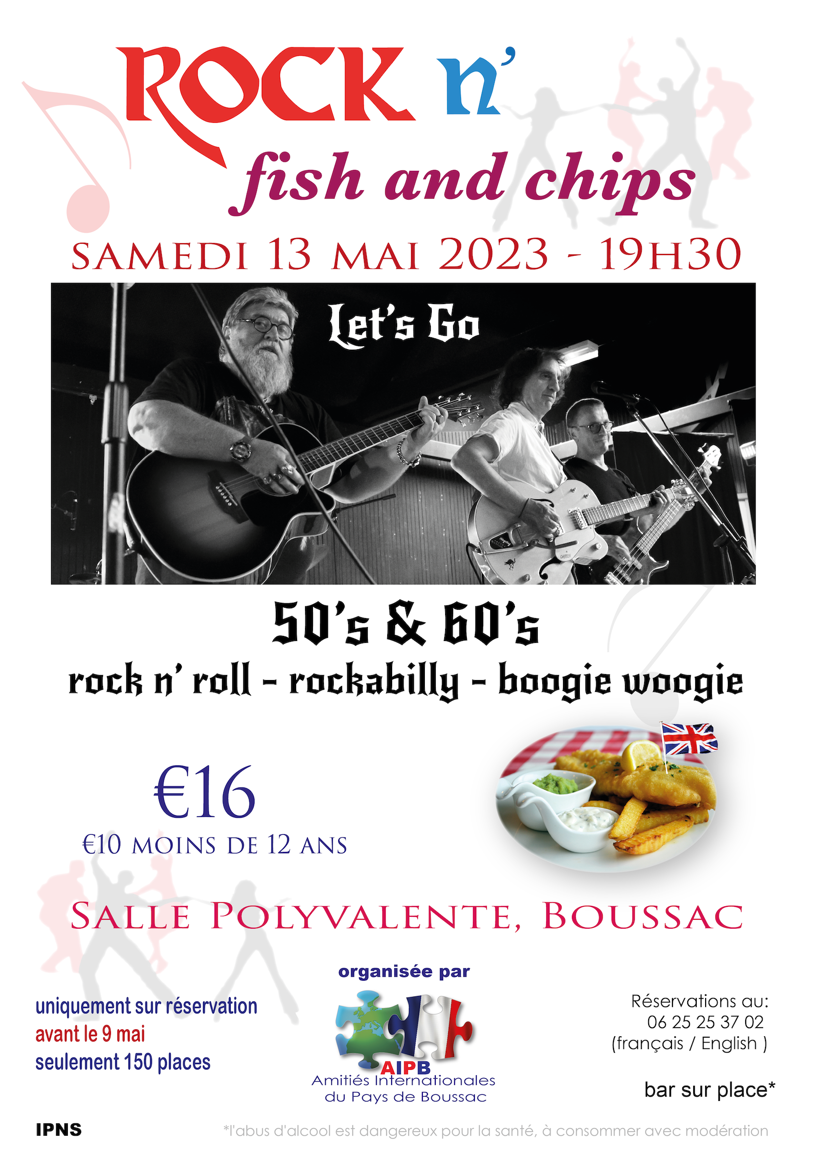 Une fois de plus retrouvons nous pour une soirée conviviale et chaleureuse entre amis pour la traditionnelle soirée ‘ROCK ET FISH AND CHIPS’ organisée par AIPB, ‘Amitiés Internationales Du Pays de Boussac –