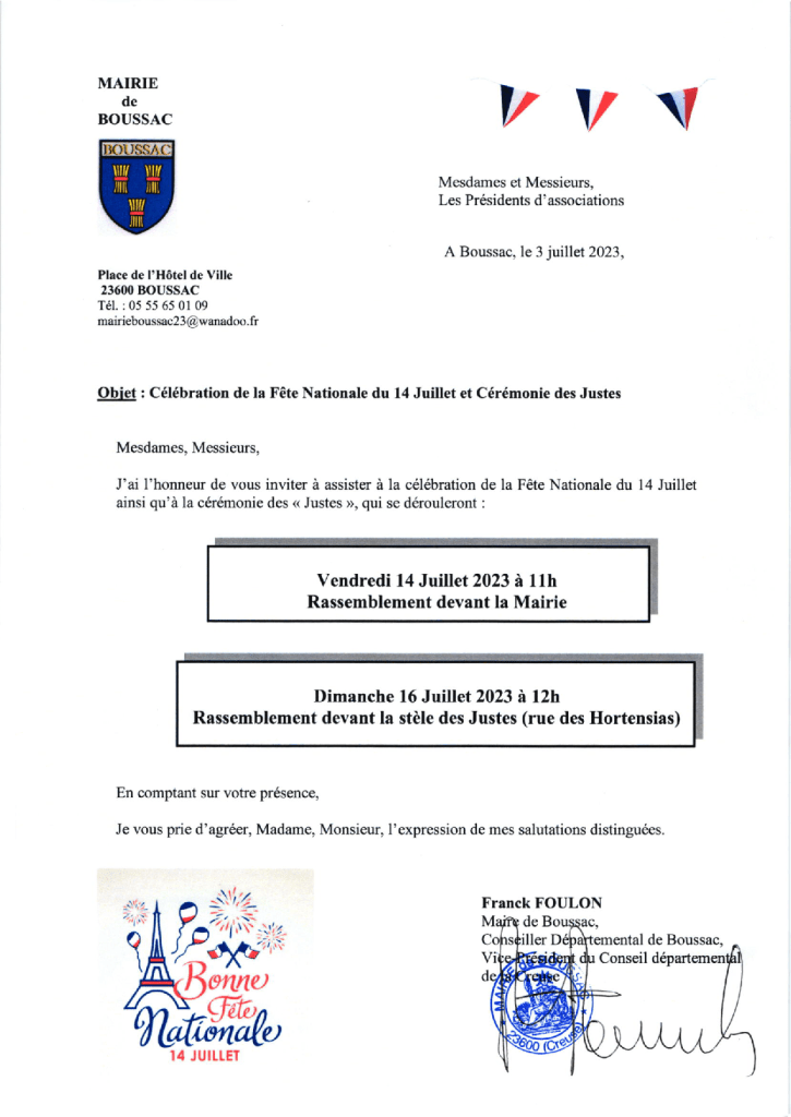 - du 14 juillet qui se déroulera à 11h (rassemblement devant la mairie),