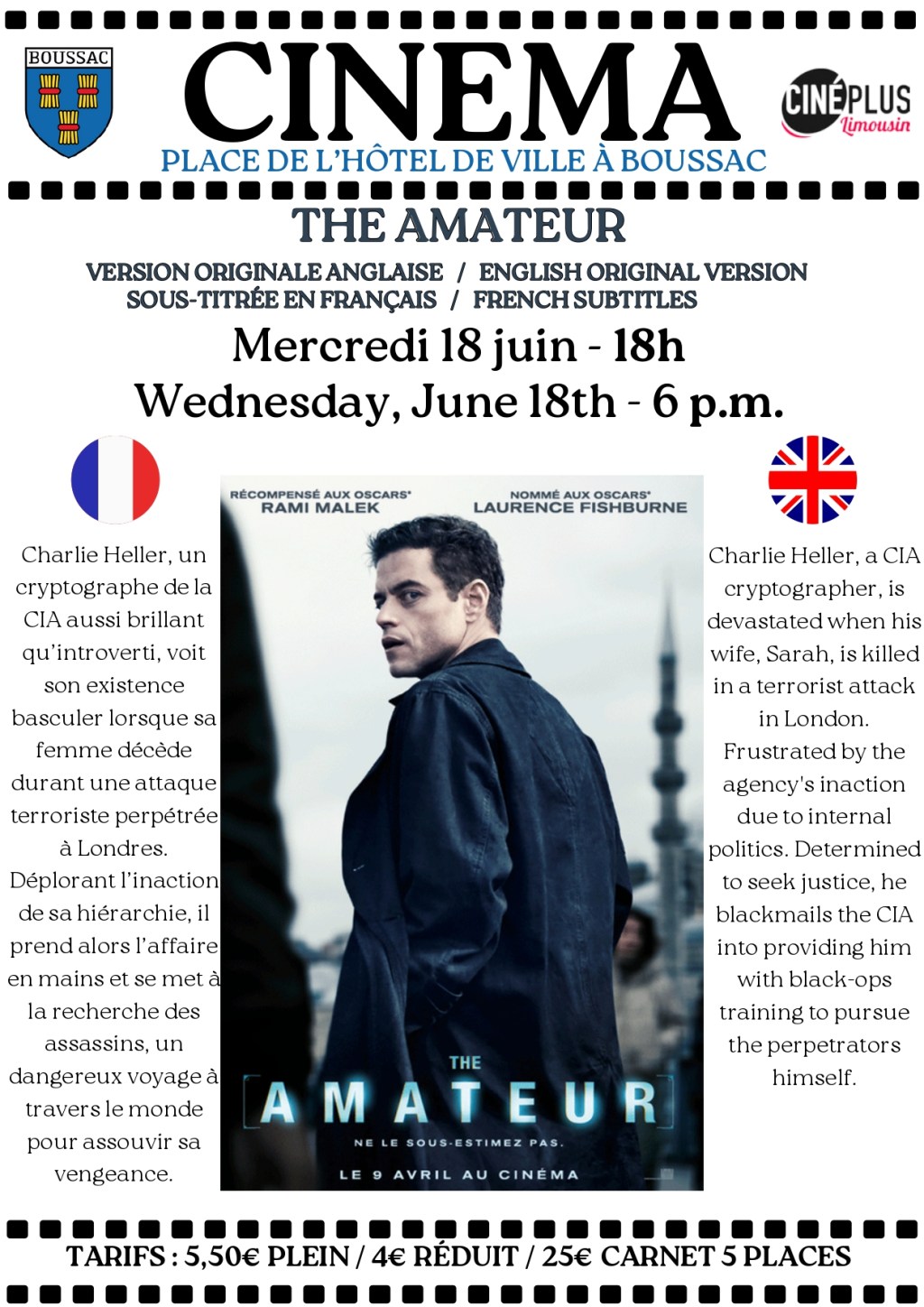 Mercredi 18 juin – pas de café franglais car le cinéma de Boussac projette The Amateur VO avec des sous-titres en français. Merci de soutenir le cinéma pour que nous puissions continuer à avoir des films en VO.