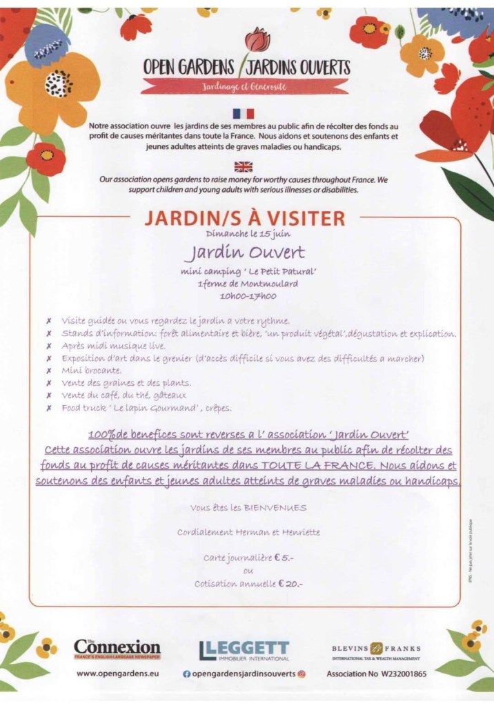 A reminder that next Sunday is the Open Gardens at the beautiful ‘Le Petit Patural’.